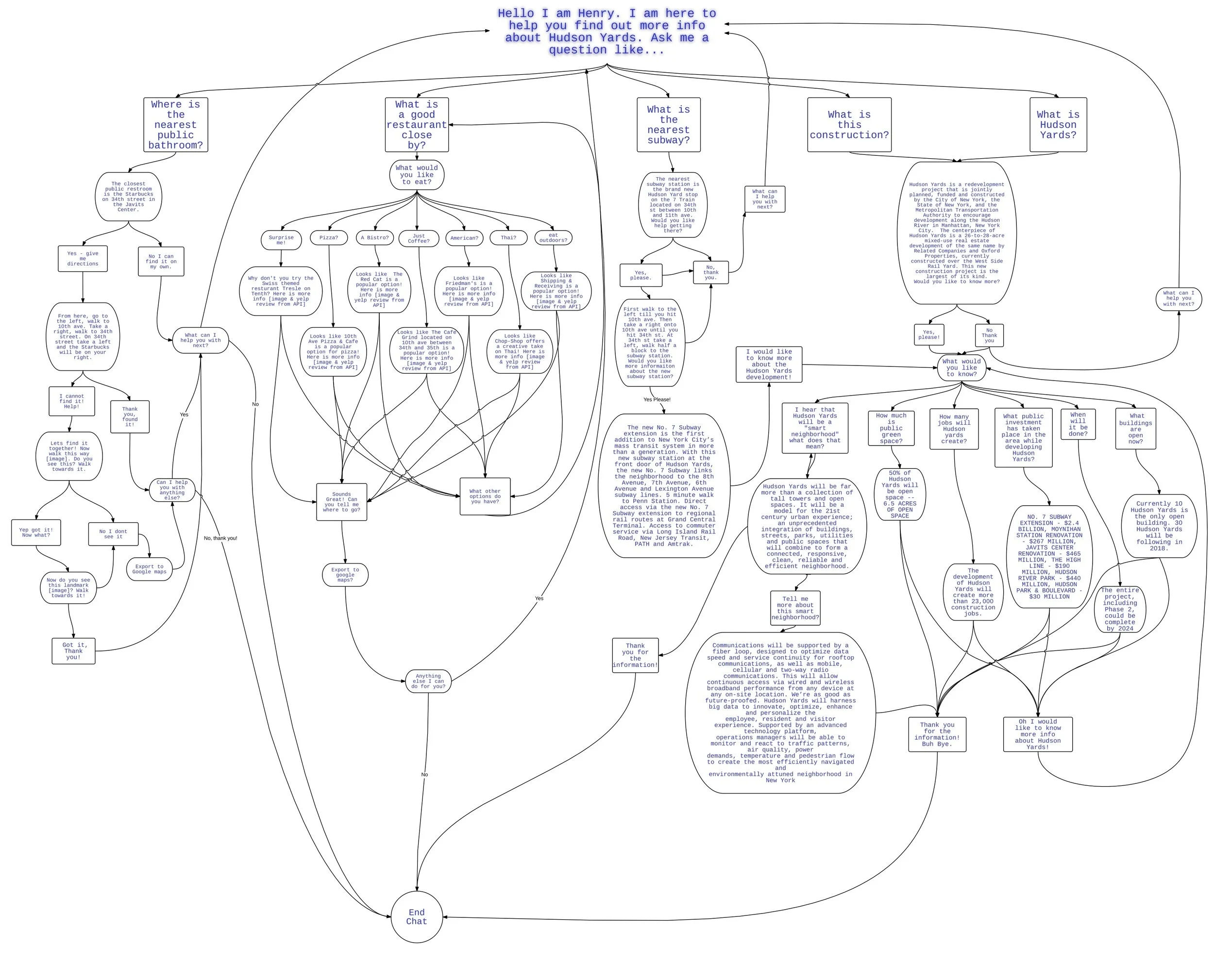 While working at Intersection I partnered with Vikash Deo to create a chatbot to help visitors find their way around the new Hudson Yards neighborhoods in NYC. The goal for the project was to assist not only with navigation and find near by points of interest but also to engage in conversable commerce with the user.